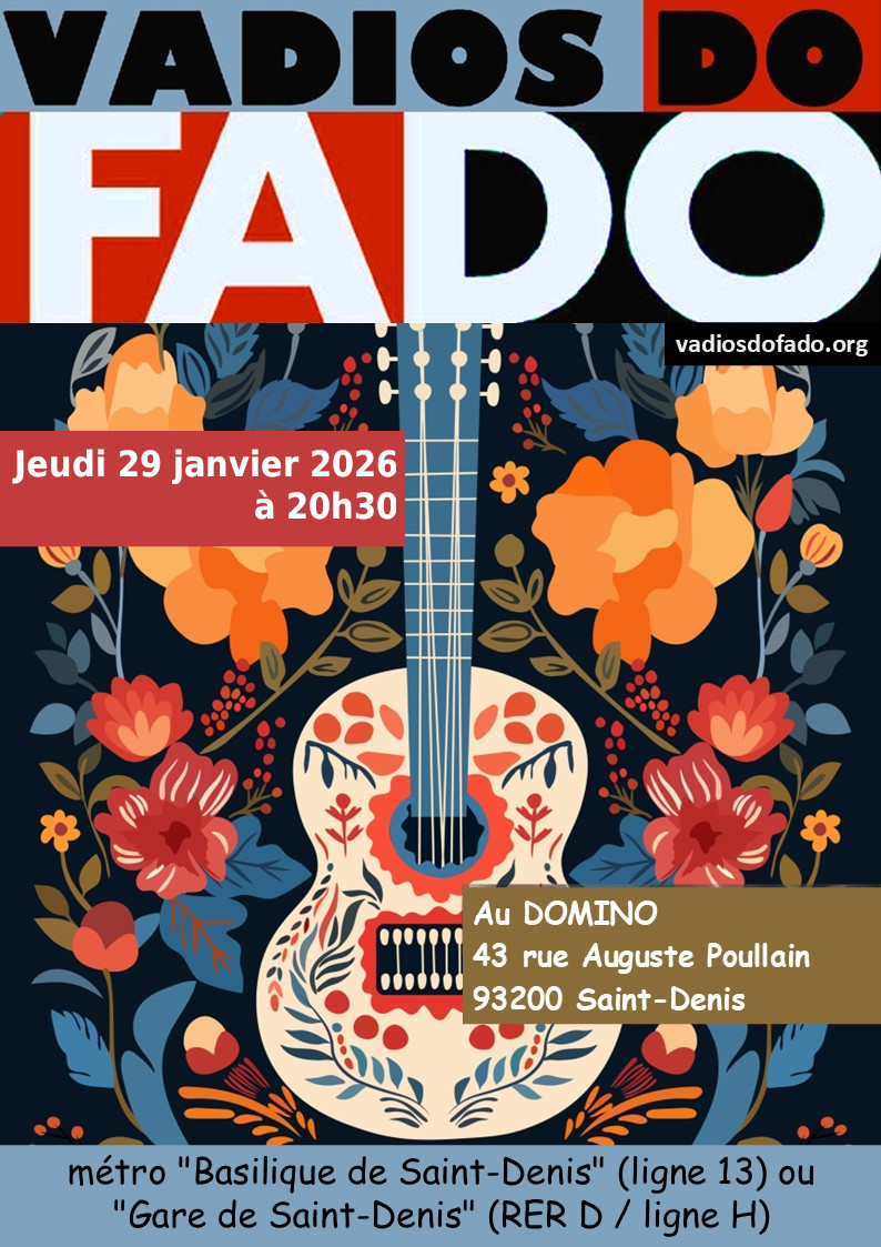 Infos : https://chapellesaintececile-flee.net/articles.php?lng=fr&pg=333#vadios%20de%20fado Mapa de acesso : https://www.chapellesaintececile-flee.net/articles.php?lng=fr&pg=74 às 19h00 no Domino 43 rue Auguste Poullain 93200 Saint-Denis Estação de metro "Basilique de Saint-Denis" (linha 13) ou Estação de metro "Gare de Saint-Denis" (RER D / linha H)